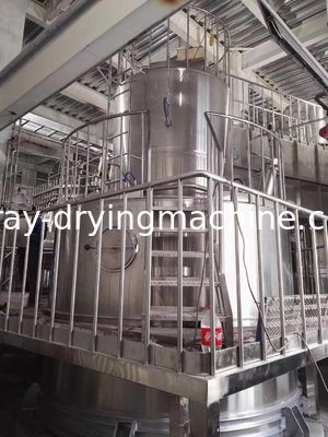 بعد تصفية الهواء وتسخينه ، يدخل إلى موزع الهواء في الجزء العلوي من المجفف. يدخل الهواء الساخن إلى غرفة التجفيف في شكل حلزوني وبشكل موحد. بالمرور عبر البخاخ الطرد المركزي عالي السرعة في الجزء العلوي من البرج ، ستدور المادة السائلة وتُرش إلى خرزات سائلة ضبابية دقيقة للغاية. من خلال الوقت القصير جدًا لتلامس الهواء الساخن ، يمكن تجفيف المواد إلى المنتجات النهائية. سيتم تفريغ المنتجات النهائية باستمرار من أسفل برج التجفيف ومن الأعاصير. سيتم تفريغ غاز النفايات من المنفاخ.